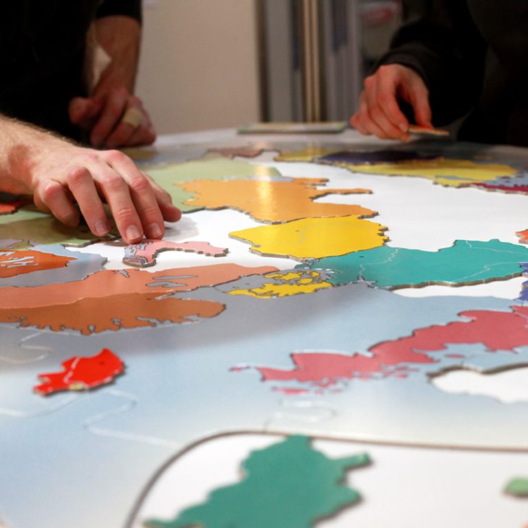 Mit dem Finger am Auslöser! Eine Sammlung der spontanen Gesichtsausdrücke der Besuchenden und Ausstellenden des 16. Deutscher Kinder- und Jugendhilfetags in Düsseldorf auf die Frage „Welches Gesicht machst du, wenn du an Europa denkst?“ von Annick Goergen.